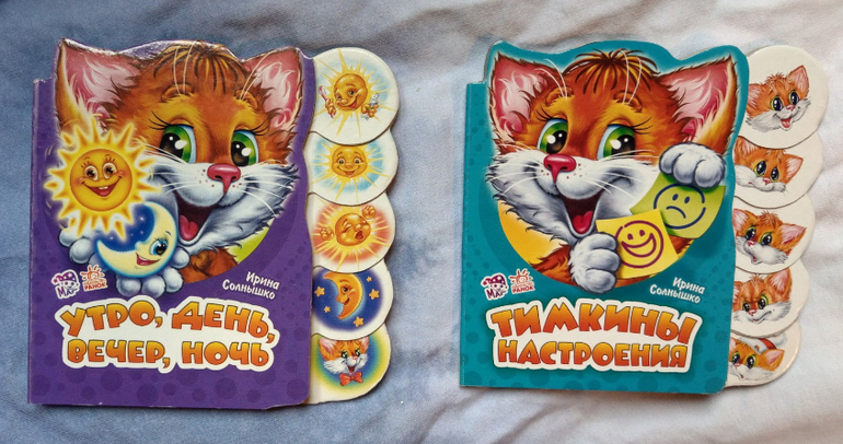 Про котенка Тима у нас две, про настроение и время суток. Вторую сын чаще открывает, особенно любит, когда я ему рассказываю, как мама кошка сыночка спать укладывает. Иллюстрации очень милые тут.