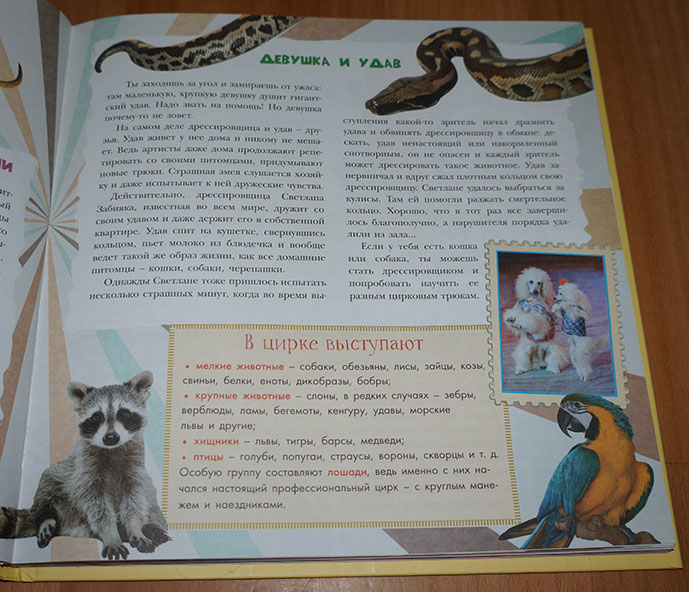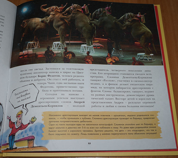 Удивительная книга. Лично я из неё узнала о цирке массу новых интереснейших фактов, о которых раньше даже не подозревала. А младшая дочка, разумеется, сразу же обнаружила рассказ о выступлениях слонов и теперь мечтает увидеть что-то подобное вживую. :)