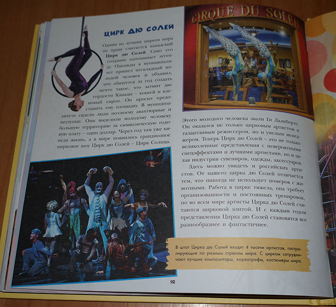 Конечно же в книге не обошли вниманием всемирно известный канадский цирк дю Солей. В штат этого цирка входит 4 тысячи артистов. А еще здесь никогда не используют номера с животными.