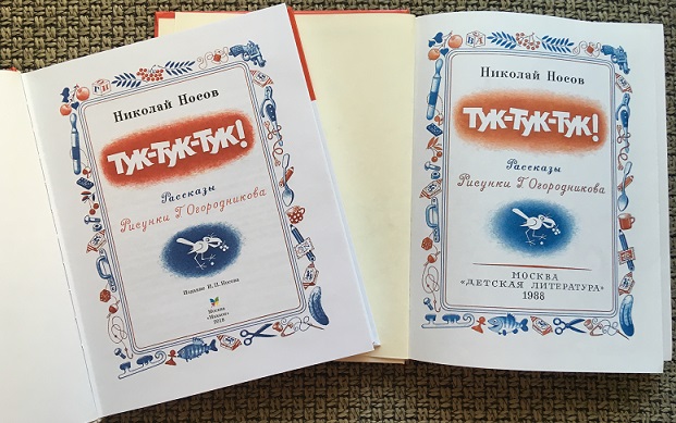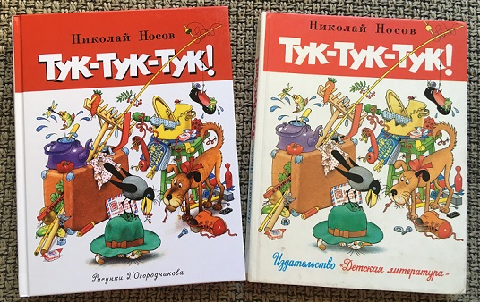 Ну а теперь к книге Н. Носова Тук-тук-тук. Средняя дочь давно является поклонницей этого писателя и его рассказов о детях. Летом я наконец-то купила книгу Тук-тук-тук, а потом через некоторое время, я "спасла" энное количество букинистики, в числе которой была и книга Тук-тук-тук 1988 года издания. Дети провели сравнительный анализ.)))