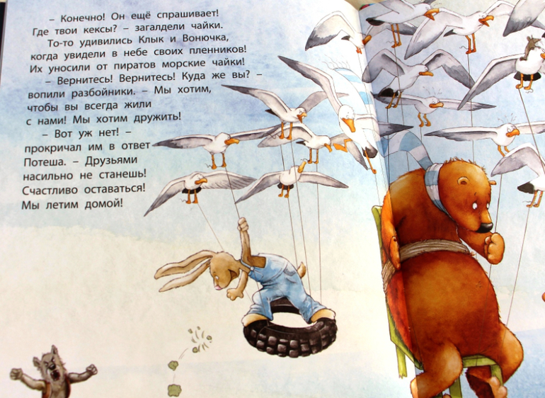Трое друзей построили воздушный корыто-корабль на воздушно-шариковой тяге. Но корабль далеко не улетел и оказались друзья на острове в плену у злюк и лентяев. Поработали они на злюк и созрел у них кексиковый план побега: они сконструировали чайковый летательный аппарат (все эти странные эпитеты от меня, не от автора). Текст небольшой и простой и для моего 4х летки и для первого самостоятельного чтения.