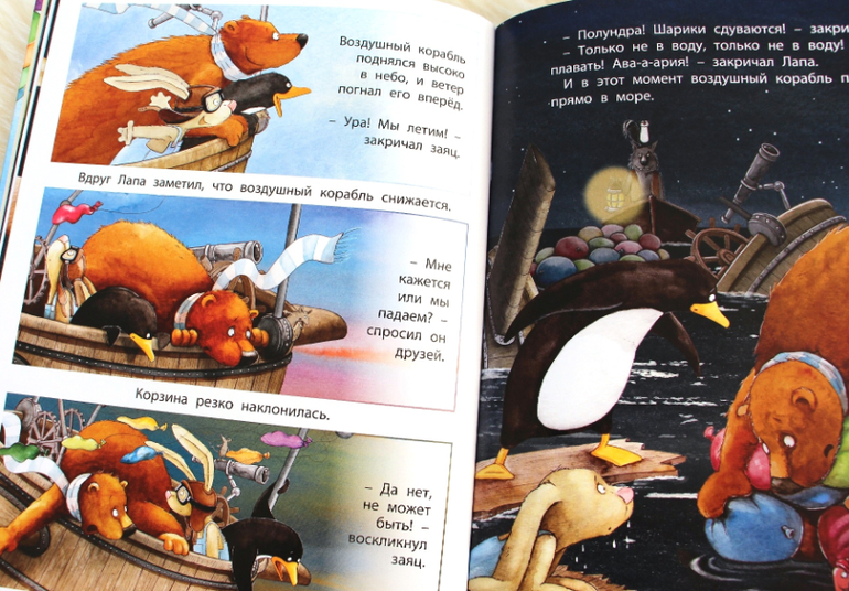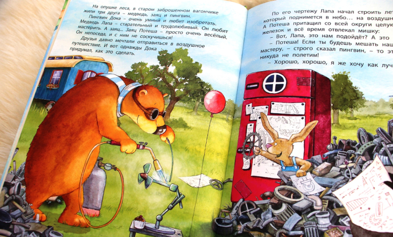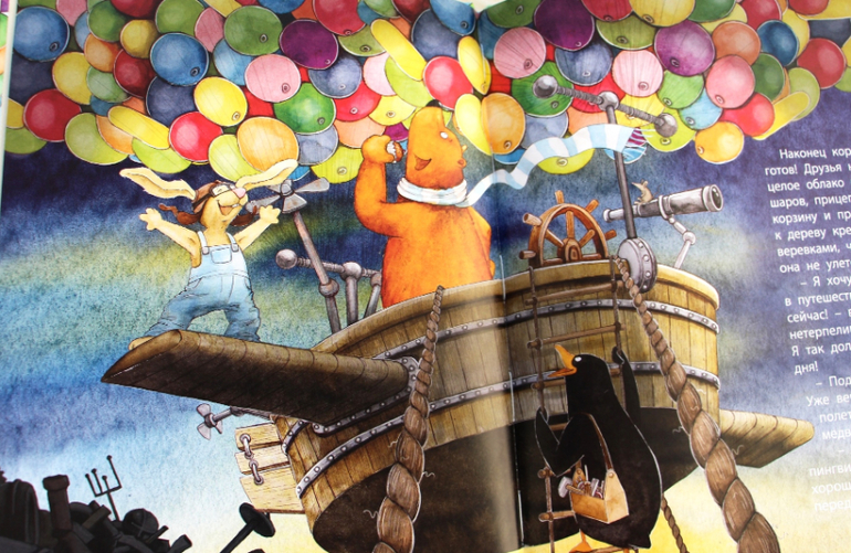 Эту книжку, как спасение, вместе с лекарствами принесла бабушка. Даже если бы мой измученный недосыпом и температурой мозг сам придумал привязывать к шарикам игрушки, то без наглядного примера и веселой истории оно не пошло бы так надолго.