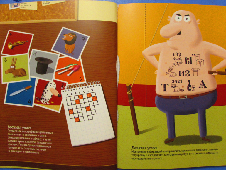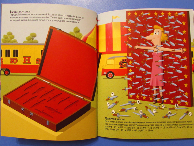 Если же с какой-то задачей возникают трудности, ответ можно подсмотреть в конце каждой истории. Для того чтобы их прочитать придется перевернуть книгу и воспользоваться зеркалом. Правильные ответы написаны в зеркальном отражении.