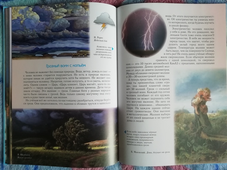 В занимательном природоведении читали главу про гром и молнии. Сыну неожиданно стало интересно про шаровую молнию. Книга своеобразная, в тексте много мифов, загадок, гипотез, но как-то коряво, на мой взгляд, объясняется физика процессов. После прочтения у ребенка еще больше вопросов, чем было.Правда, я сужу по одной главе. Но в общем мне понравилась книга, я сама в детстве такие любила, чтоб не совсем энциклопедично, но с загадками.