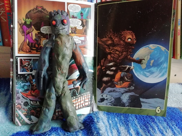 В январе сын наконец-то дочитал комикс про Грута. Это первая книга, которая попала в наш дом без моего тщательного отбора и я смутно догадываюсь, про что она. Догадываюсь по вопросам: "Мам, а что такое каннибализм?" , "Мам, а что значит 'Прости, что опустил тебя'" "А 'отстой?'". В общем, книга не для дошкольников, явно.. Сюжет сын совершенно не понял, юмор, слова - все непонятно для него (и слава Богу!), но тот факт, что книгу дал почитать друг сделал ее любимой. Сын часто зависал над картинками, придумывал свои истории. Даже слепил главного героя.