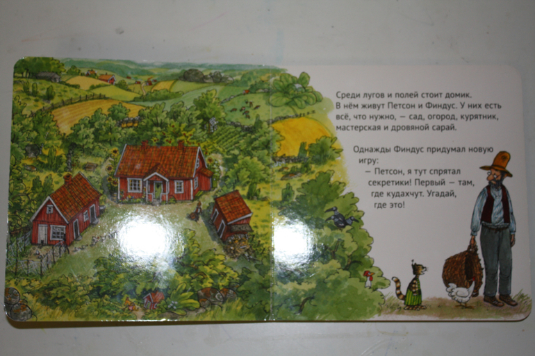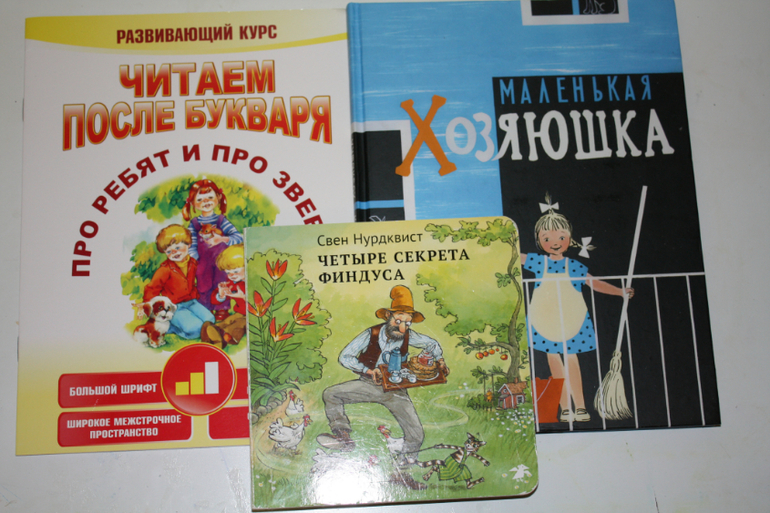 Для чтения после Азбуки, у меня были заготовлены книги для самостоятельного чтения. Я их читать ребенку отказывалась. На полочке стояла книжка-картонка про Петсона и Финдуса(любимые герои).