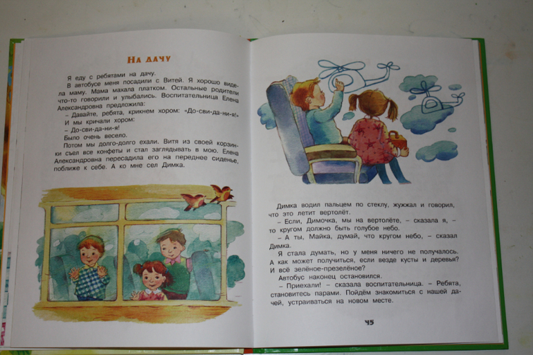 В сборнике Гайды Лагздынь нам подошли рассказы про детский сад, который выехал летом на дачу. Дочка любит читать про детей.