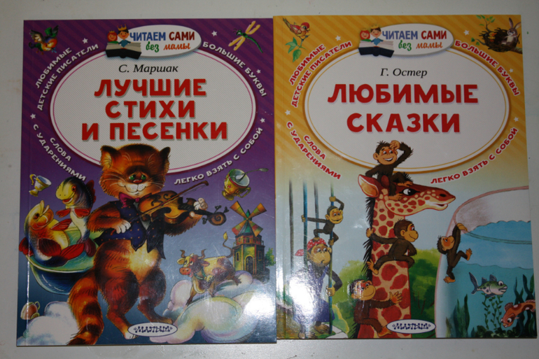 "Читаем сами без мамы" брала в дорогу. Небольшие книги с мягкой обложкой, иллюстраций не много, шрифт крупный.