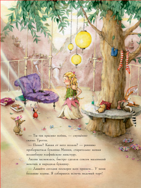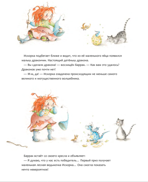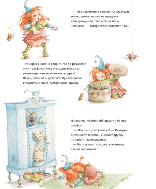 Узнаваемый стиль иллюстраций Штефани Дале с первых страниц книги погружает читателя в атмосферу доброго лесного волшебства. Искорка - самая непоседливая и нетипичная из всех фей Солнечного леса. Её рыжие волосы вечно растрепаны, а на чулках красуется огромная дырка (к счастью, под юбкой это незаметно). Среди домашних любимцев Искорки - большие пауки, жаба Квака и целый террариум ящериц. Ну и кот Пумперникель, конечно. Искорка любит всех! Чего не скажешь о других ведьмах, с которыми Искорке предстоит соревноваться в магическом искусстве. Малышке будет непросто показать, чего она стоит! Но она обязательно справится.
