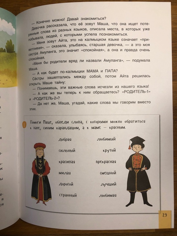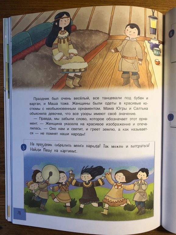 Другой тип заданий вне сюжета. Это различные развивающие задания, использующие бытовые предметы, традиции и жизнь того народа, про который в данный момент идет рассказ. Стоит заметить, что задания поданы очень нестандартно и интересно, например, соединялка: мама, папа и слова - как можно обратится к маме, а с какими к папе - очень мило J.