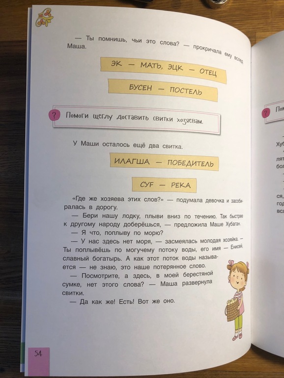 В книжке их два типа. Первый тип напрямую связан с сюжетом - это поиск и возвращение этих слов народам. Это непросто, нужно сначала догадаться, какое слово потеряно и запомнить, как называется народ, у которого они исчезли. Выполнение этих заданий дополнительно простимулировано наклейками-свитками, которые Маша отдает почтовому щеглу, который через страницы несет свиток хозяевам, и дочка наклеивает свиток. А так как наклеивать наклейки ей очень нравится, то она искренне старается запомнить все потерянные слова.