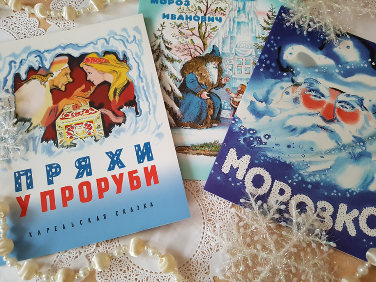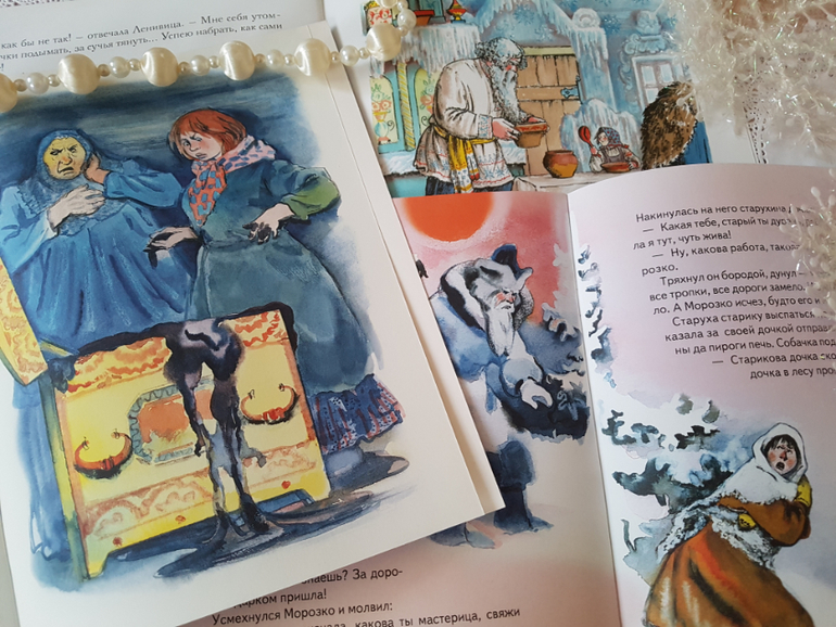 Самые зимние сказки с похожим сюжетом. "Морозко" и "Пряхи у проруби" с кровожадной концовкой)), Одоевский в "Морозе Ивановиче" в этом плане пощадил злодеек)). Первые две с прекрасными иллюстрациями Носкович, но образы получились очень похожими.