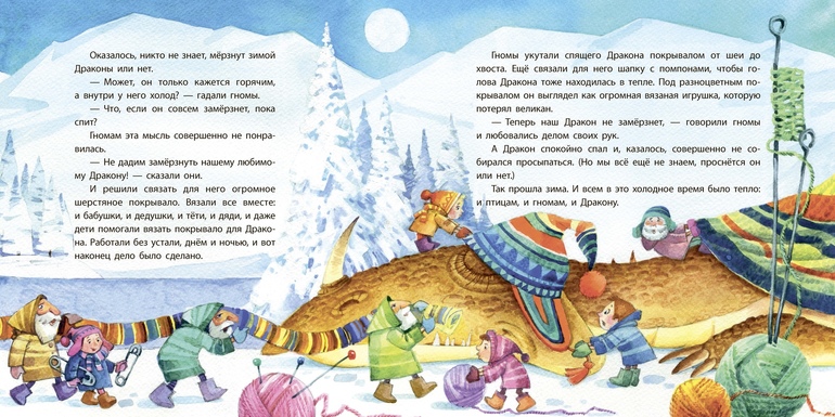 Они сбились в кучку и стояли тихо-тихо, боясь пошевелиться. Что сделает сейчас их любимый Дракон? Встанет на ноги и сразу растопчет домики? Съест самих гномов, потому что сильно проголодался? Развернет крылья, встряхнется после долгого сна, и птичьи гнезда посыплются с его спины прямо на землю? Гномы и птицы готовились к самому худшему...