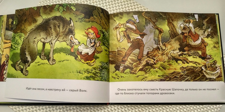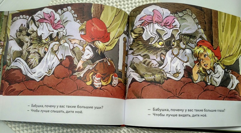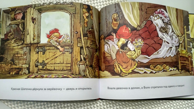 И ещё одной часто читаемой книгой стала Красная Шапочка с рисунками Мигунова. То что надо для малышей, каждая строчка проиллюстрирована, видны эмоции героев, все события, передвижения.