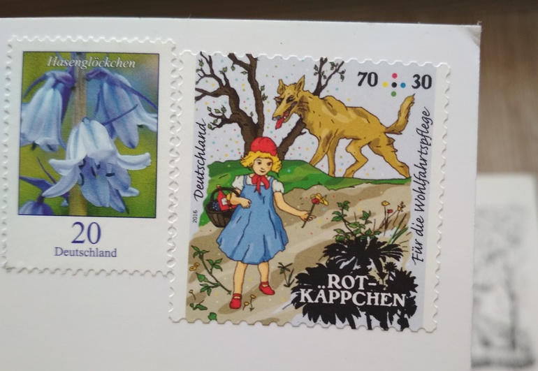 Флешмоб!Попробуете угадать мою книгу, не заходя под кат? Это не Красная шапочка))) Важно, что это немецкая марка с Красной шапочкой и серым волком)