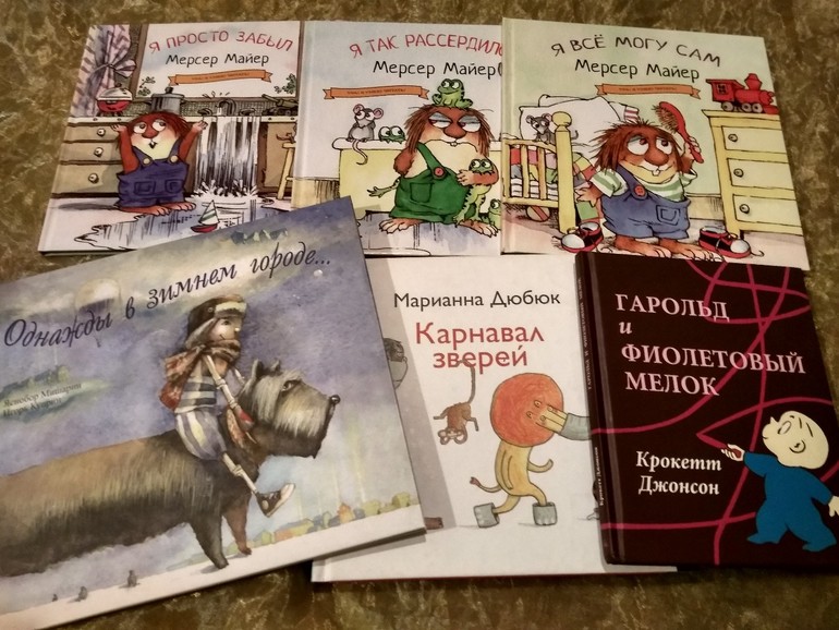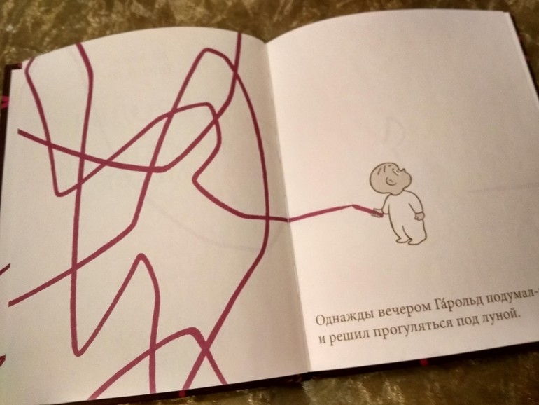 Гарольд и фиолетовый мелок - вообще не помню, как он попал в заказ. Не помню на что я повелась, потому что фотографии в лабиринте не привлекали ничем. И вообще я думала, что приедет приличная большая книга! Я ж, как всегда, забыла посмотреть на размеры, и формат меня разочаровал. И я толком не помню, как менялось мое отношение, потому что отлично помню свое раздражение при первом чтении, на страницах с лосем и полицейским - уж рога и физиономию можно было бы и "правильнее" нарисовать. Но уже через пару прочтений я смирилась с явными перекосами типа каких-то елок вместо лосиных рогов, в остальном же меня устраивало все. Одна из редких книг-историй, побуждающих мысленно осваивать пространство и строить собственную реальность "из воздуха". Очень полезная и нужная. Хотелось бы еще подобных книжек в библиотеку. Но не знаю каких, чего-то бы уже не рисовального...