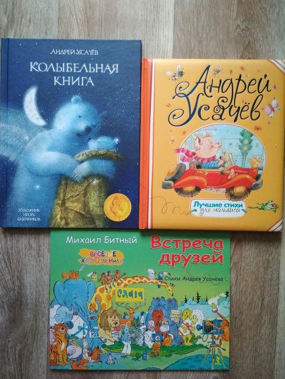 А вообще первой детской книгой в доме стал сборник Усачёва, который купил наш нечитающий папа, когда Маше было месяца два) Жёлтенький, справа)