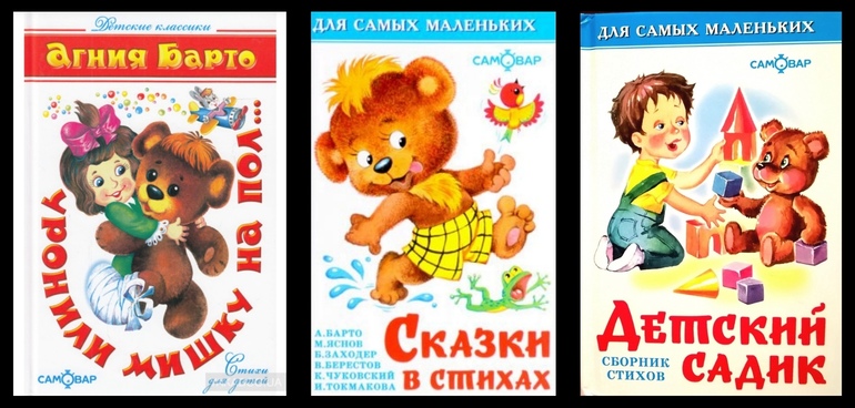 Но если быть честной, то я до этого уже делала заказ для дочки, когда была ещё беременна. Заказала тут, в Германии, три книги Самовара, потому что выбор был не особо большой. Кстати, они вполне неплохие, но Барто у нас я заменила, "Сказки в стихах" куда-то положила - там тоже много пересечений с другими имеющимся книгами, а "Детский садик" так и живёт на полочке и изредка читается.