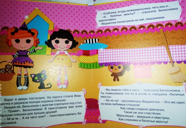 При первом прочтении возникло ощущение бессвязности текста: навели порядок, пошли гулять, увидели ведьму - убежали, услышали смех в домике - постучали, погуляли на пижамной вечеринке, наводят порядок, объелись плюшек от ведьмочки - заснули. Больше всего мне неприятен стих про девчонок и мальчишек: