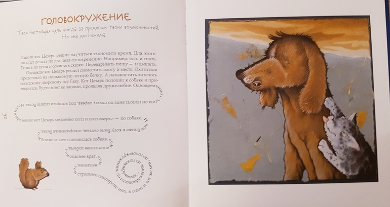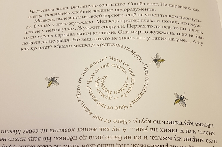 Текст в книге такой же неоднозначный как иллюстрации - он вдоль, поперёк, по спирали, вверх ногами... Как "неизвестность пускает мысли по кругу", так и в этой книге, много текста по кругу.