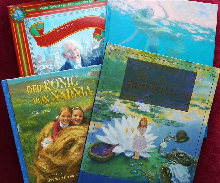 Рождественскую песнь я вообще не планировала покупать, но с такими иллюстрациями не удержалась. Русалочка есть ещё в нн-ом количестве сборников, но это же Бирмингем :) Нарния тоже не планировалась вовсе, тем более на немецком. До сих пор не понимаю, что меня дёрнуло купить её на немецком, а не в оригинале на английском. Чтобы дочка точно прочитала? Ну-ну. Посмотрим. Ну а -цатый сборник сказок Андерсена (зато с какими иллюстрациями!) был необходим ;) Куда-то ещё спряталась книга про лебедя с его иллюстрациями, о которой я вообще узнала только из-за поиска по иллюстратору, ну да пусть.