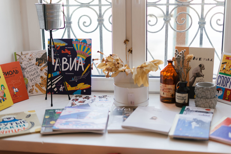 Новые полки с книгами. Мы заходили сюда летом, и немножко побродили среди редко расставленных старых тарелок и причудливых тканей. А теперь появились книги.