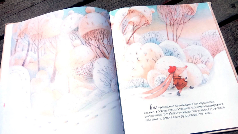 Автор очень постарался, чтобы эта книга отличалась от тысяч других книжек-картинок. Эта же задача была поставлена и перед художником. Ведь как еще объяснить, что фантазия художника выдала нам симпатягу-поросенка с такими длинными ушами и очень изящную корову на льду. Как еще объяснить, что спокойные, будто размытые иллюстрации воспринимаются яркими и завораживают своей сказочностью.