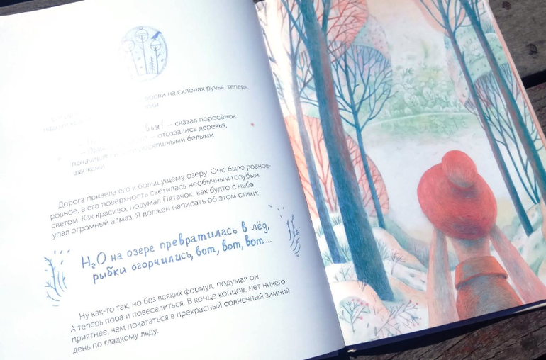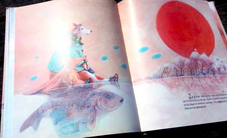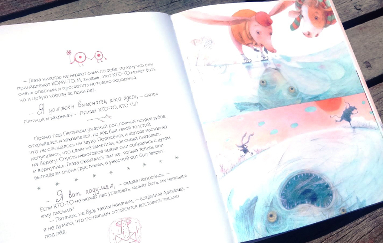 Но вернусь к истории. История ласковая и эмоциональная одновременно. Пятачок позвал корову покататься на коньках. Они наслаждались прекрасным днем и закатом, как вдруг лед вздрогнул. Друзья не сразу поняли, что это большая рыба подо льдом привлекает их внимание. Пятачок стал писать рыбе на льду свои слова, а она отвечала ему на иностранном языке: