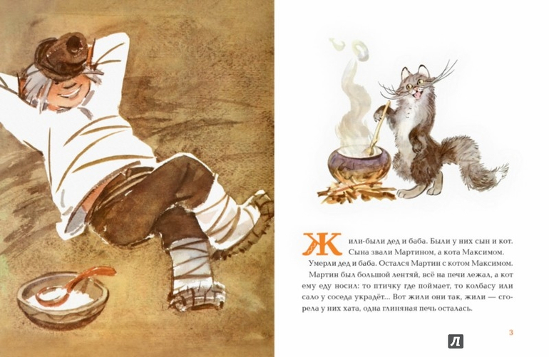 Ох, и лентяй же Мартин! Всё на печи лежит, работать не идёт, а Кот Максим ему еду носит. Сгорела хата, а следом и печь развалилась… Недолго думал Мартин, как же ему быть, и решил жениться, чтобы супруга богатая ему новый дом построила. А в невесты себе выбрал саму царевну!