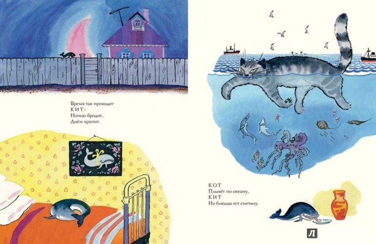 Кто бы мог подумать, что кит будет с удовольствием ловить мышей и ест из мисочки сметану. А кот - "огромный, просто страшный" - станет бороздить просторы океана и плавниками бить волну. Целый год учёные и журналисты пытались понять, где тут кит, а кто тут кот... Читателям же разобраться в этой путанице помогут остроумные и жизнерадостные иллюстрации Евгения Мешкова.
