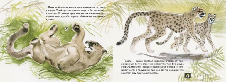 Чем похожи и чем отличаются друг от друга лев, тигр, леопард, пума, гепард и другие представители семейства кошачьих? Об этом вы узнаете из книжки, проиллюстрированной Татьяной Порфирьевной Капустиной, знаменитым художником-анималистом.