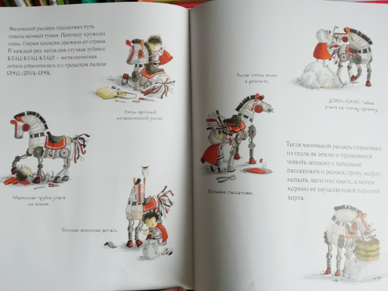 Пыталась расспросить его о книгах, но кроме "интересная, смешная" ничего не смог сказать) Про Маленький рыцарь, который боролся с драконом добавил только, то там есть механический конь, и это очень здорово))