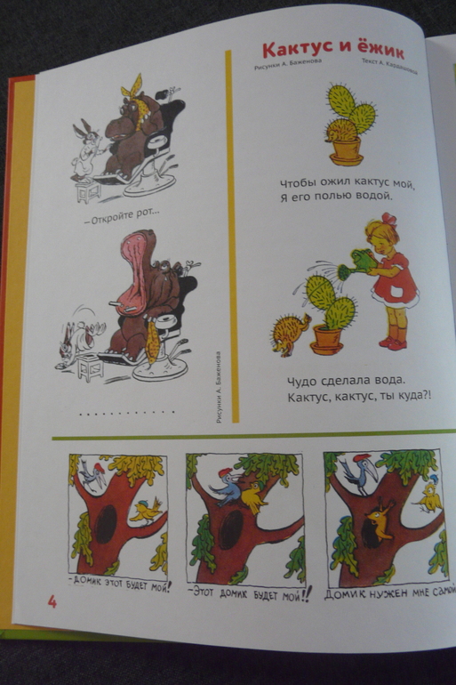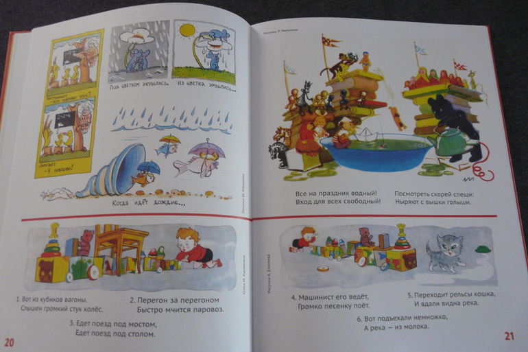 В книге есть развороты, где только 2 стихотворения, а также, где много коротких шуток, сюжетных картинок и т.д