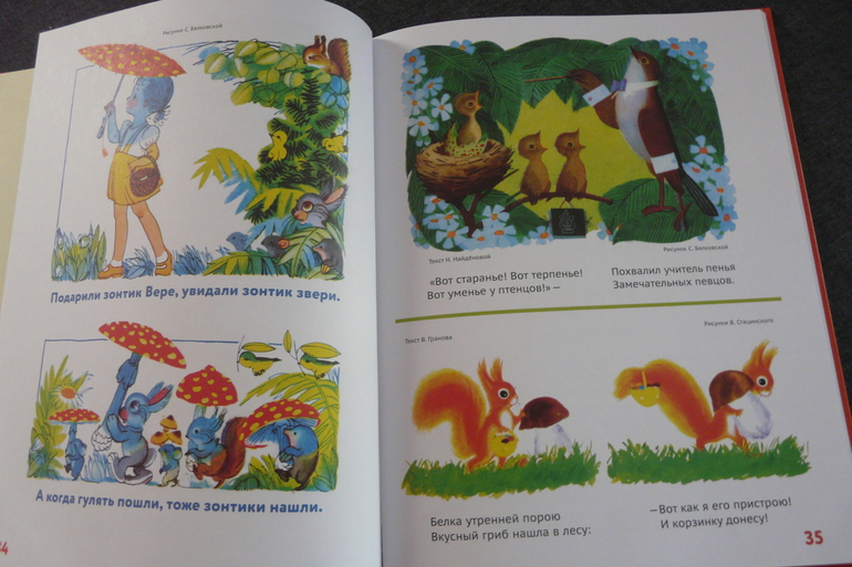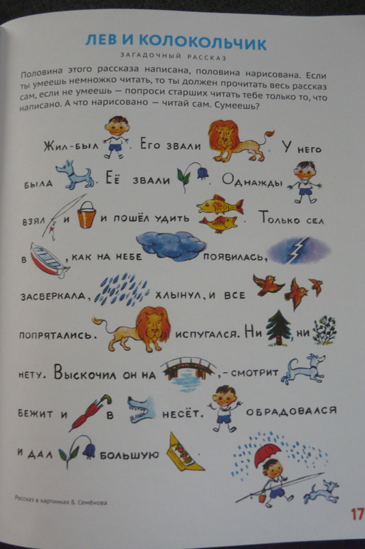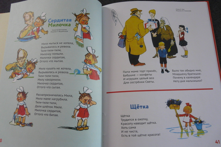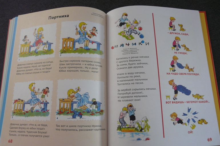 Моему ребенку книга оч. нравится, есть любимые страницы,многие строчки выучили наизусть.Мы только начинаем читать,поэтому читаем названия стихов или отдельные слова.