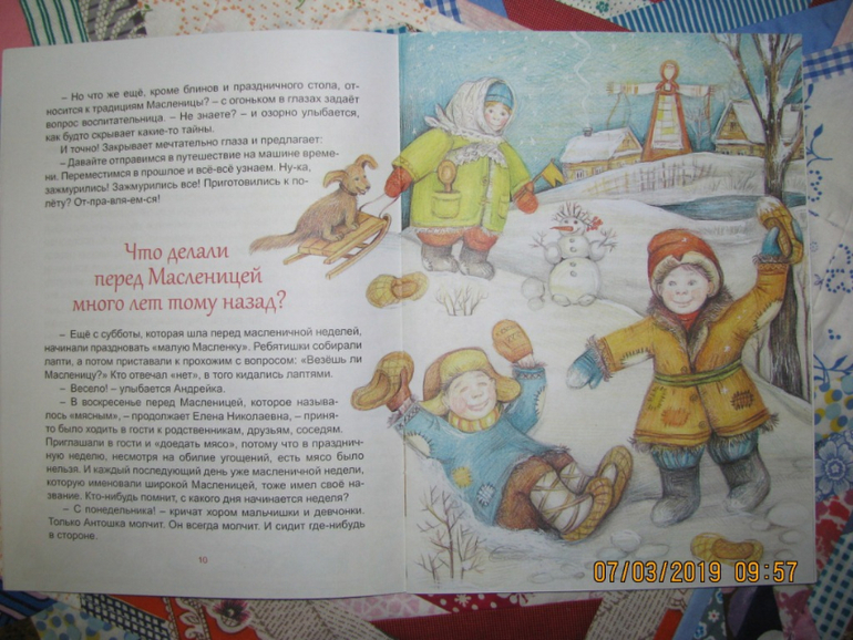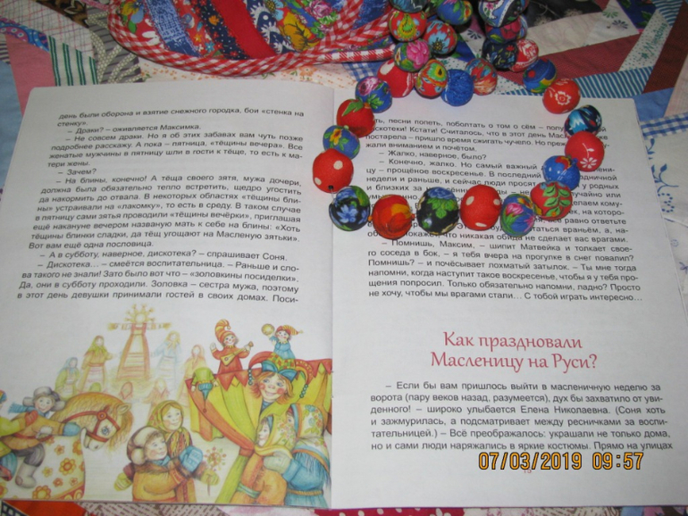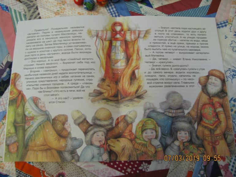 Удивительно, как много смысла бывает заложено в простых вещах. И если вам интересны давние традиции предков, у вас есть желание рассказать о них своим деткам, возьмите книгу Марии Евсеевой "Широкая Масленица. Солнышко на тарелке". Главные герои книги - детишки детсадовской группы - получают ответы на вопросы о праздновании масленичной недели. Красочные иллюстрации образно дополняют сюжет книги.