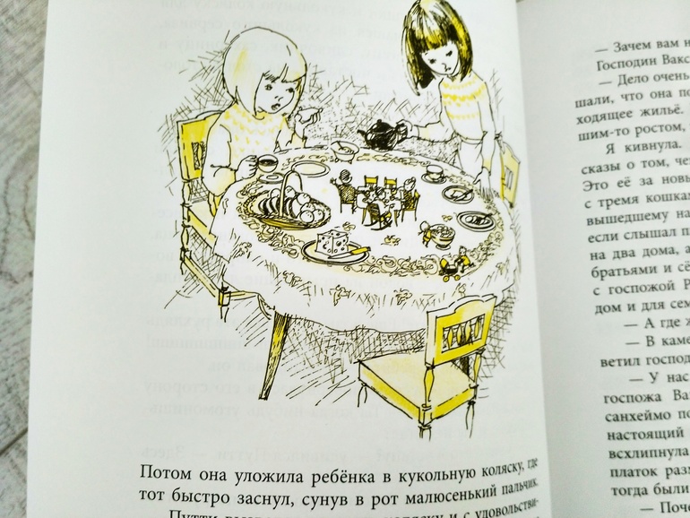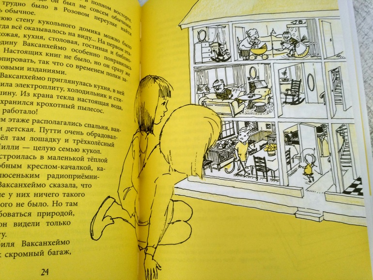 Вторая книга Зима Оннели и Аннели тоже поразила тем, как точно попала в ещё одну детскую мечту, и не только мою. Очень многие дети любят мелкие игрушки, фигурки животных, кукол, человечков, с удовольствием строят им домики, разыгрывают целые истории, придумывают диалоги, беседы. А в этой книге у Онелли и Анелли появились живые обитатели их кукольного домика!! Целая семья маленьких людей, которые могут жить в их кукольном доме. Девочки с интересом наблюдают за ними, разговаривают, пытаются помочь, вместе обедают за одним столом.