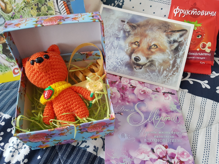 Люба, сюрприз просто умопомрачительный, спасибо огромное! Мужу нахвасталась, он сказал-ну рукодельницы!)))Лисенка тискаю-тискаю, нюхаю))), из рук не хочется выпускать. Как ты отлично с коробочкой придумала, он у меня там и живет на полочке, хоть и хочется его везде таскать с собой))).
