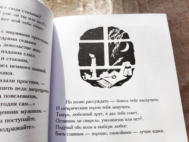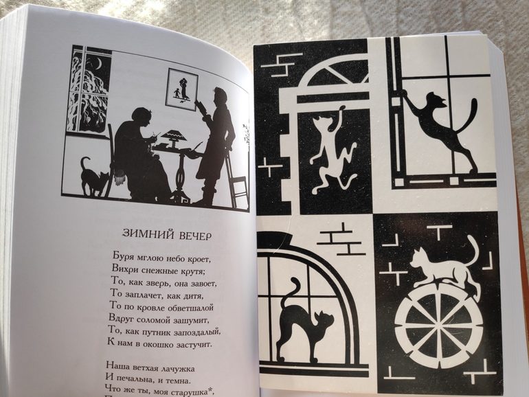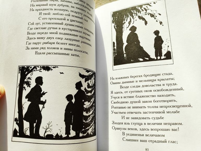Давно знакомые по журнальным и книжным публикациям иллюстрации Николая Ильина манили и притягивали. К тому же мне очень нравится серия Малая Классика Речи как идеальный формат не для прозы, а именно для поэзии. Пусть будет дубль! Пусть Пушкин стоит на разных полочках. Протянуть руку и взять. Какого тебе сегодня хочется? Строгого силуэтного? Утонченно-легкого и ажурного? Или классически-живописного Онегина? Или академических примечаний и вклеек?
