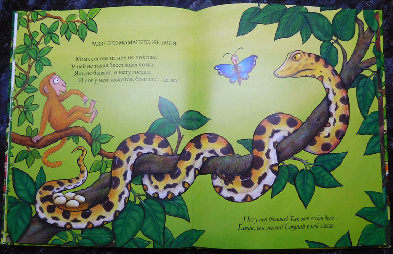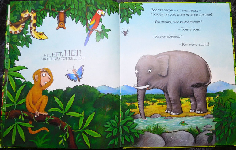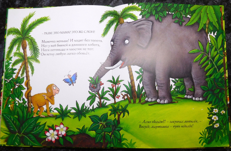 Например, обезьянка говорит, что мама большая, и мотылёк ведёт малышку к слону; мама может хвостом обвить ветку - герои идут к змее...