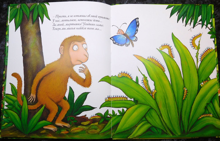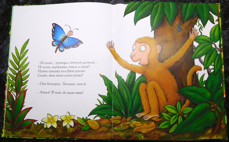 Моя дочь особенно полюбила эту книгу ближе к трем годам, но, думаю, сказку можно читать детям лет с полутора. Сюжет прост, но интересный и познавательный: маленькая обезьянка потеряла маму, и мотылек пытается ей помочь.
