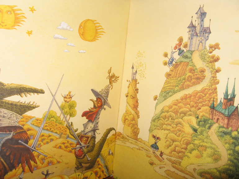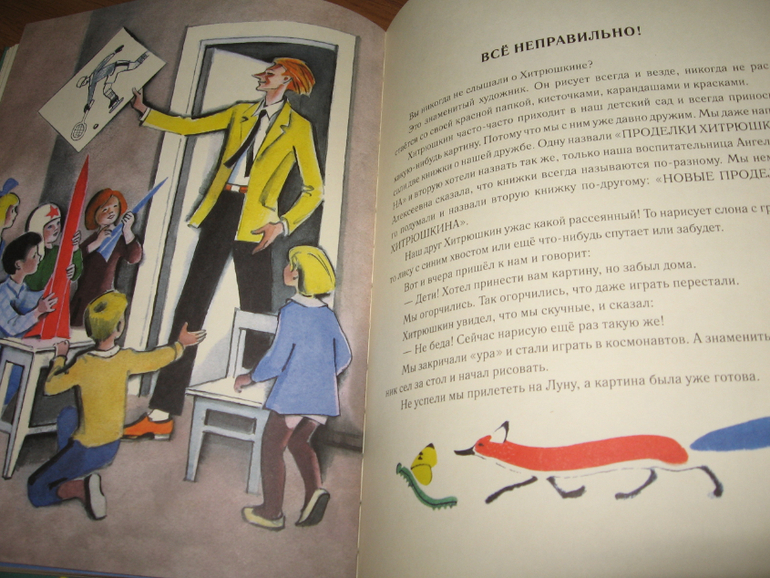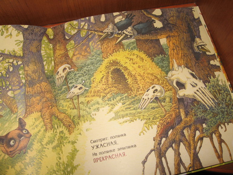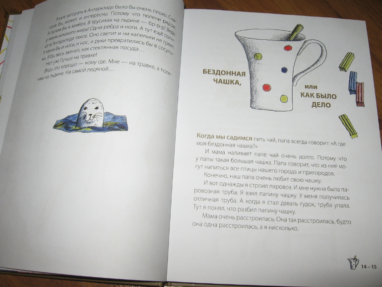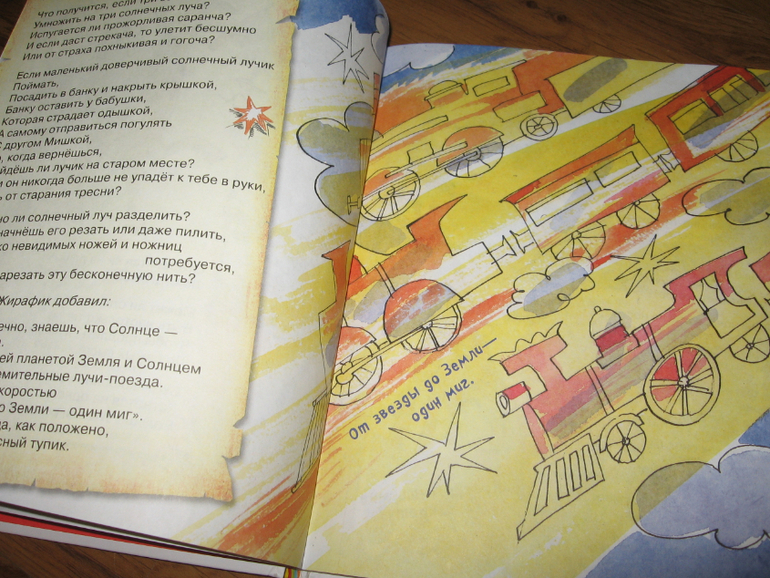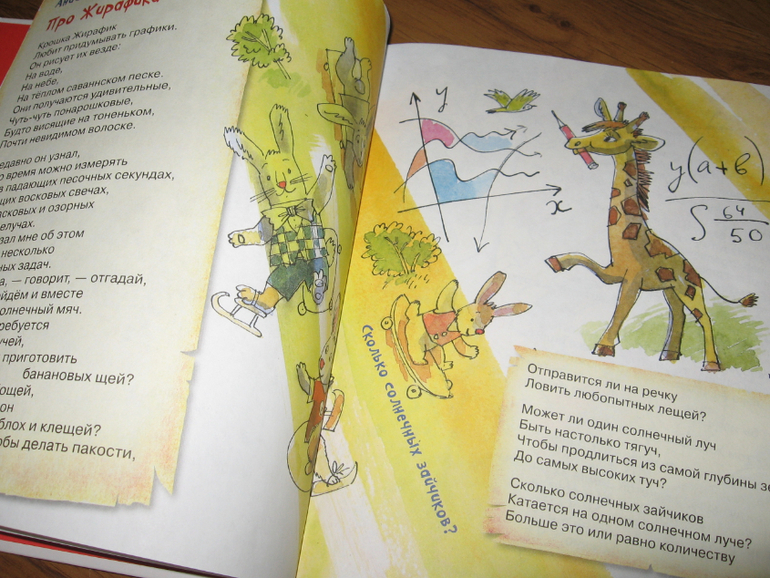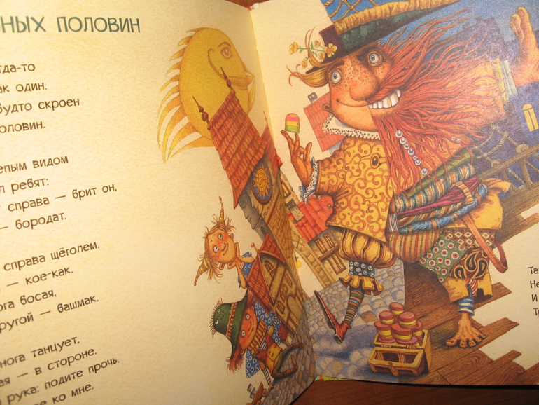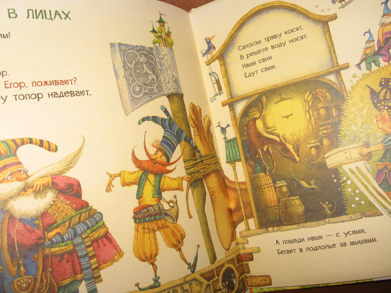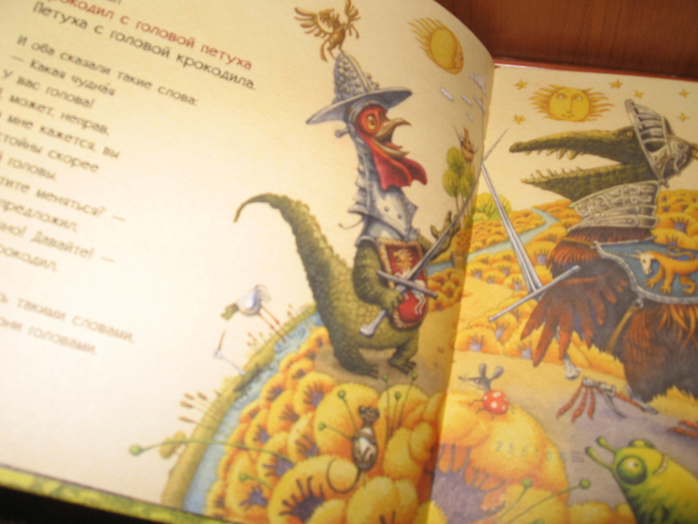 С этой книгой у нас тоже случилась любовь) Тут даже непонятно, что больше пришлось по душе: очень веселые стихи Генриха Сапгира или яркие хулиганские рисунки. Вот настолько все в книге гармонично, что тяжело ее выпустить из рук. И цвета-то у рисунков все ярко-солнечные, теплые, яркие. Книгу в руки взял и как будто лучик за хвост сумел ухватить. И вот хоть объем у книги не большой - всего 30 страничек, а и стихов-то всего четыре штуки, но благодаря рисункам удовольствие от книги просто колоссальное. Хотя может это только нас так "торкнуо" :))) Я ее за один вечер только пять раз подряд читала, по кругу. Может и больше пришлось бы, только я уже возмутилась и отложила книгу, т.к. язык уже заплетаться стал, а читать требовалось с выражением и на разные голоса желательно.