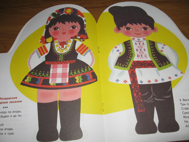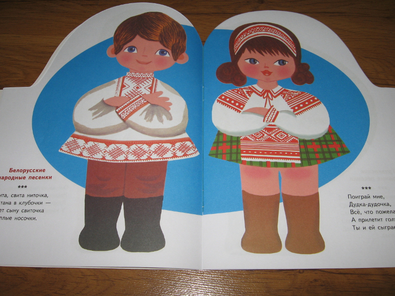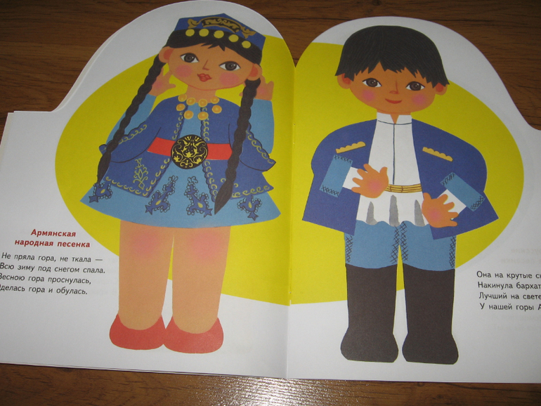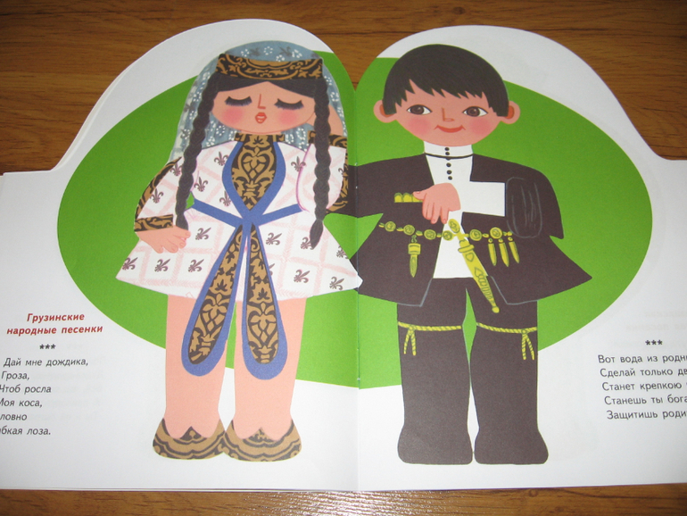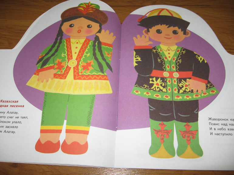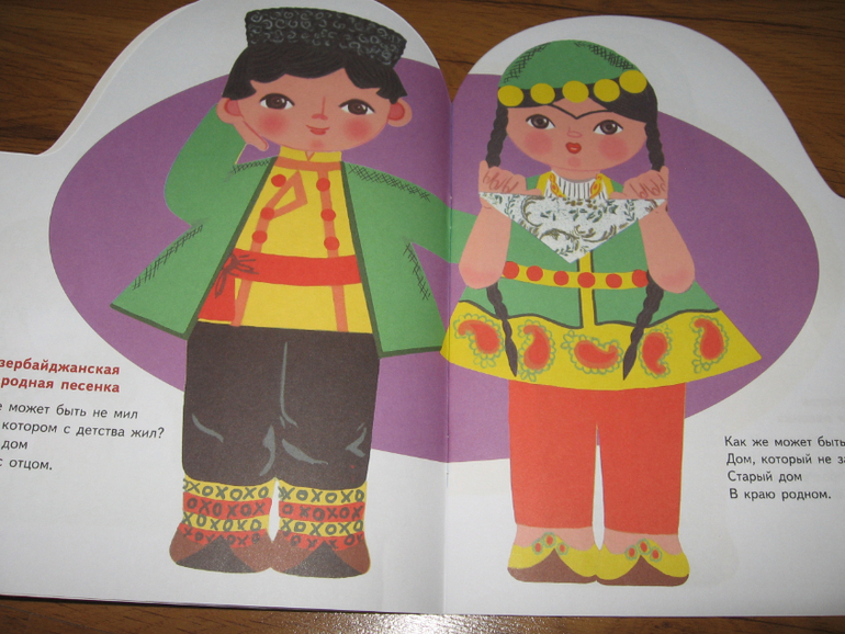 Песенки разных народов для пяти лет может уже и простоваты, но вместе с рисунками Лилии Майоровой, с элементами национальных костюмов у Алисы идут очень хорошо. Тем более, что она потом начинает с книгой играть, придумывать что-то свое и рассказывать об этом куклам и медведю. Да и по количеству страниц эта книга пожалуй самая "толстенькая" из всей серии. Ну и фольклор, на мой субъективный взгляд, для любого возраста хорош и знакомиться с ним полезно хотя бы для общего развития.