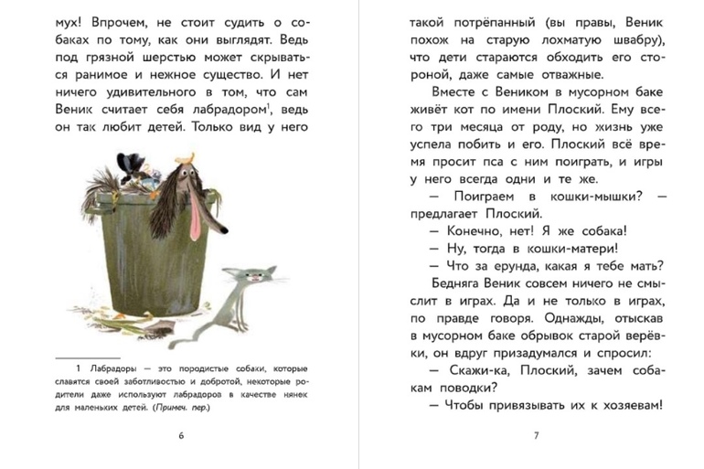 Знакомьтесь: пёс Веник - очаровательный, наивный и нежный! Да, он родился в мусорном баке и слегка похож на швабру. Но не стоит судить по внешности. Сам Веник считает себя лабрадором, ведь он так любит детей. И так хочет найти себе друзей! И пусть вначале он ошибается и готов отправиться за первым встречным человеком, бросившим ему: "Пойдём со мной". К концу книги он обязательно разберётся, кому можно доверять и с кем стоит дружить.