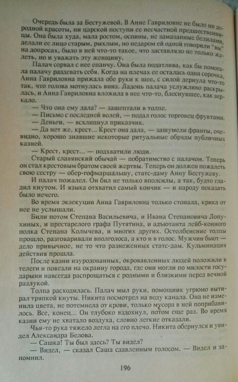 В книге самый тяжелый момент казни Лопухиной и Бестужевой, я кстати, почему то всегда думала, что их казнили, а их высекли плетьми и отправили в ссылку.. но жалко их безмерно, сложилось впечатление, мужики власть делят, а женщин отвечать пришлось..