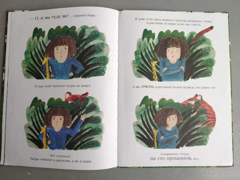- Интересный сюжет. По совету бабушки девочка Нора превращает "скучный старый сад" в целые джунгли, где водятся стрекозы размером с птиц, ворчливый белый медведь и чудесный тигр;