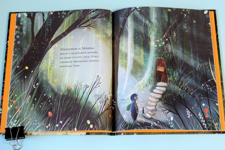 Иллюстрации очаровательны! Когда Мышонка манили огни большого города, в его комнате было много книг о городе: "Городские огни", "Небоскрёбы", "Мышь в большом городе", "Городские сказки", "Побег из леса"...)) Когда он собрался на Луну, то и подборка из книг стала соответствующей: "Космос", "Космические сказки", "Луна - это сыр", "Путеводитель по космосу" ( в книге ошибка в слове путИводитель), "Лунная книга" и другие. Всегда приятно рассматривать такие мелочи.