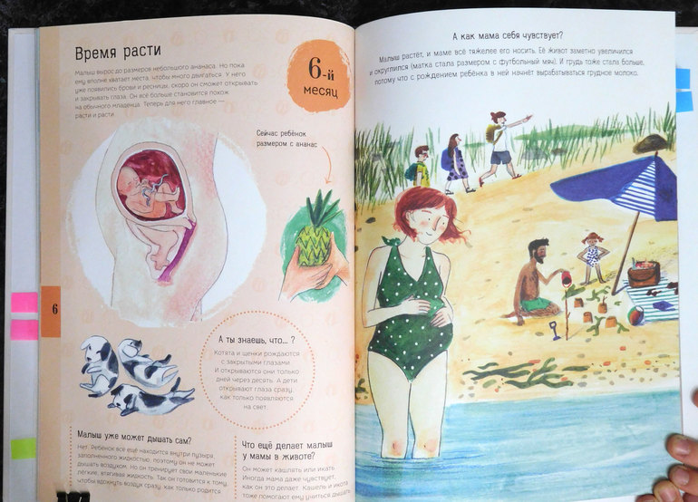 Оформление разворотов, где рассказывается о месяцах беременности, однотипно - это облегчает чтение: справа изображена мама и написано, как она себя чувствует; а слева мы видим малыша в животе, основной текст и несколько интересных фактов.