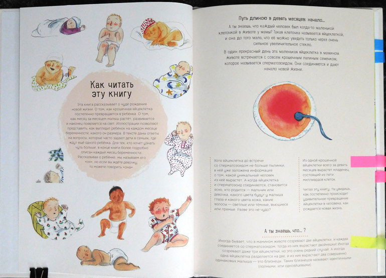 Текст мне очень понравился. Тема непростая. Я всегда смотрю, как авторы подобных книг рассказывают о зачатии и родах. И в этом издании меня всё устроило: с одной стороны, всё достаточно информативно, по делу; с другой стороны, всё прилично, без лишней натуралистичности. Наверное, поэтому книга и адресована дошкольникам.