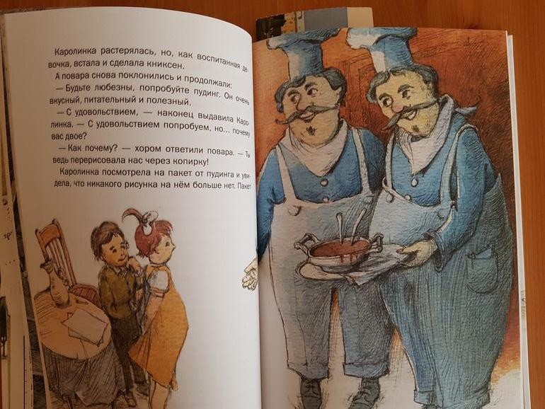 Здесь у Каролинки новая невероятная находка - волшебный голубой мелок. Всё, что им ни нарисуешь, становится явью. Правда, голубого цвета : голубой кот, голубые белки и ослики... голубые повара, перерисованные с обёртки от шоколадного путинга) сначала, разумеется, мелок дети тратят на всякую ерунду, а потом более осознанно. Ну и, конечно, такая уникальная волшебная вещь нужна коварной Филомене, голубую бусинку ей отобрать не удалось, получится ли с мелком?