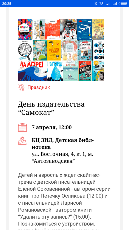 Анна Сестренка в Детские книги 7 лет День издательства самокат мероприятия Подобнее тут http://zilcc.ru/afisha/7070.html?utm_type=fest&muid=1c340600-93f5-4473-8936-6a5c831be01b&category=04a6660a-c3fe-4fc3-84a6-60afd7dc9422 Посмотрите еще 20 записей на эту тему Отменить Ответить Неделя детской книги Издательство "Эксмо" приглашает на праздник «Мир приключений Изадоры Мун»! Чаты Беременных Выберите чат: Январята-2026 Февралята-2026 Мартята-2026 Апрелята-2026 Майчата-2026 Июнята-2026 Июлята-2026 Августята-2026